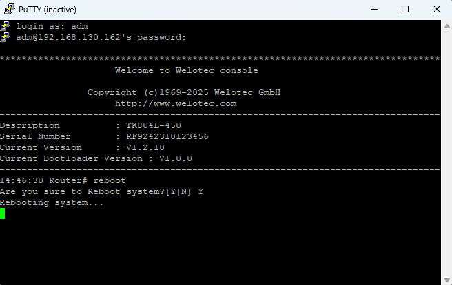 Start PuTTY, enter router IP, select SSH/Telnet.