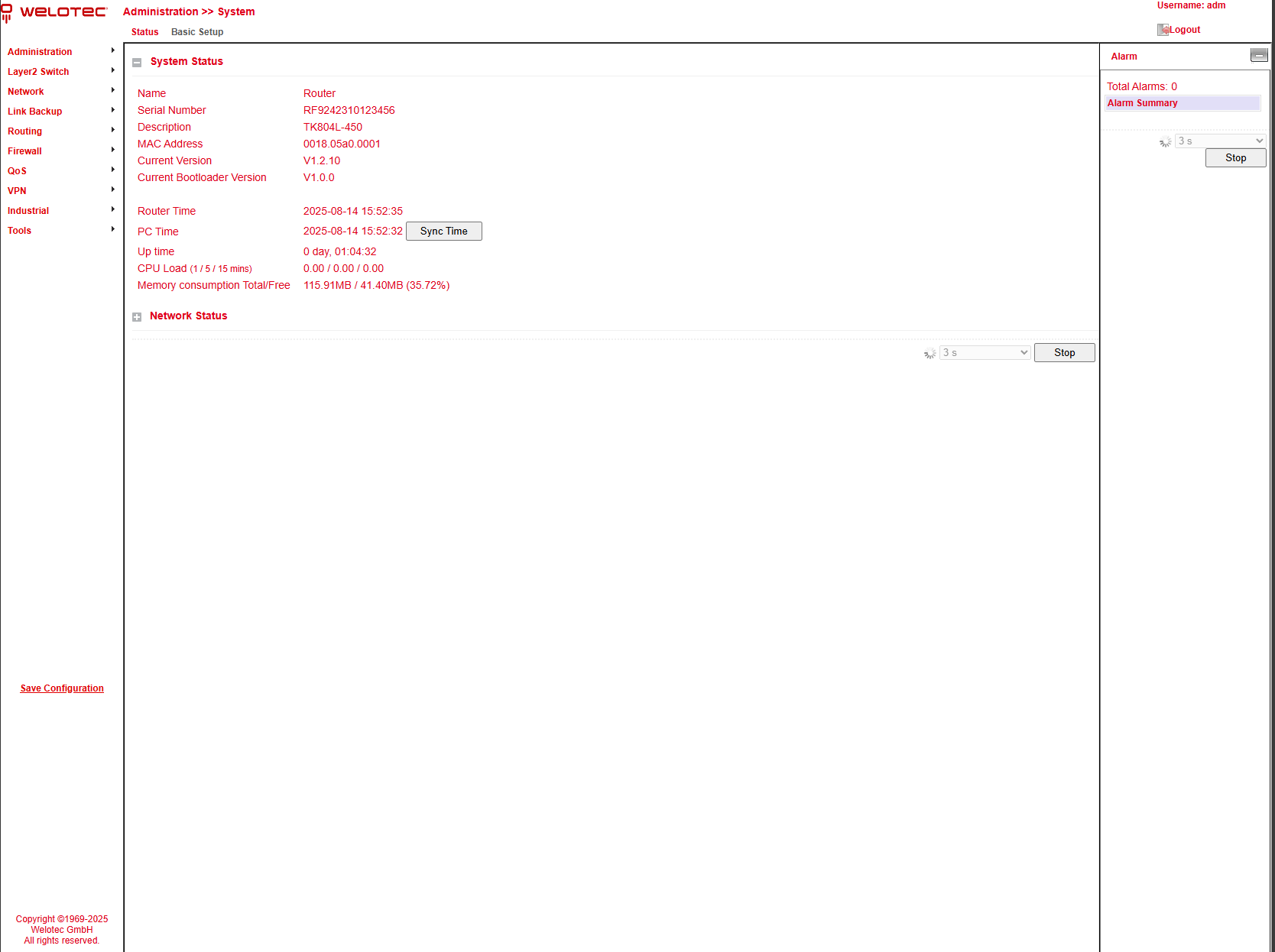 Under Administration > System > Status you will find the most important status information of the router at a glance.