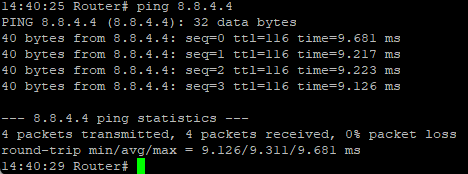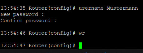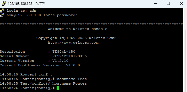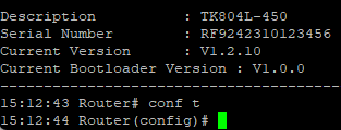 In the superuser view, the router can use the configure command to switch the configuration view for management. A configure command can support no and default, where no indicates setting the abort of a parameter and default indicates restoring the default setting of a parameter. The configure terminal (or conf t for short) command switches the system to configuration mode. In this setting the router can be configured. To exit the configuration mode use the exit command. All entered commands must be terminated with the wr command so that the changes are applied to the router.